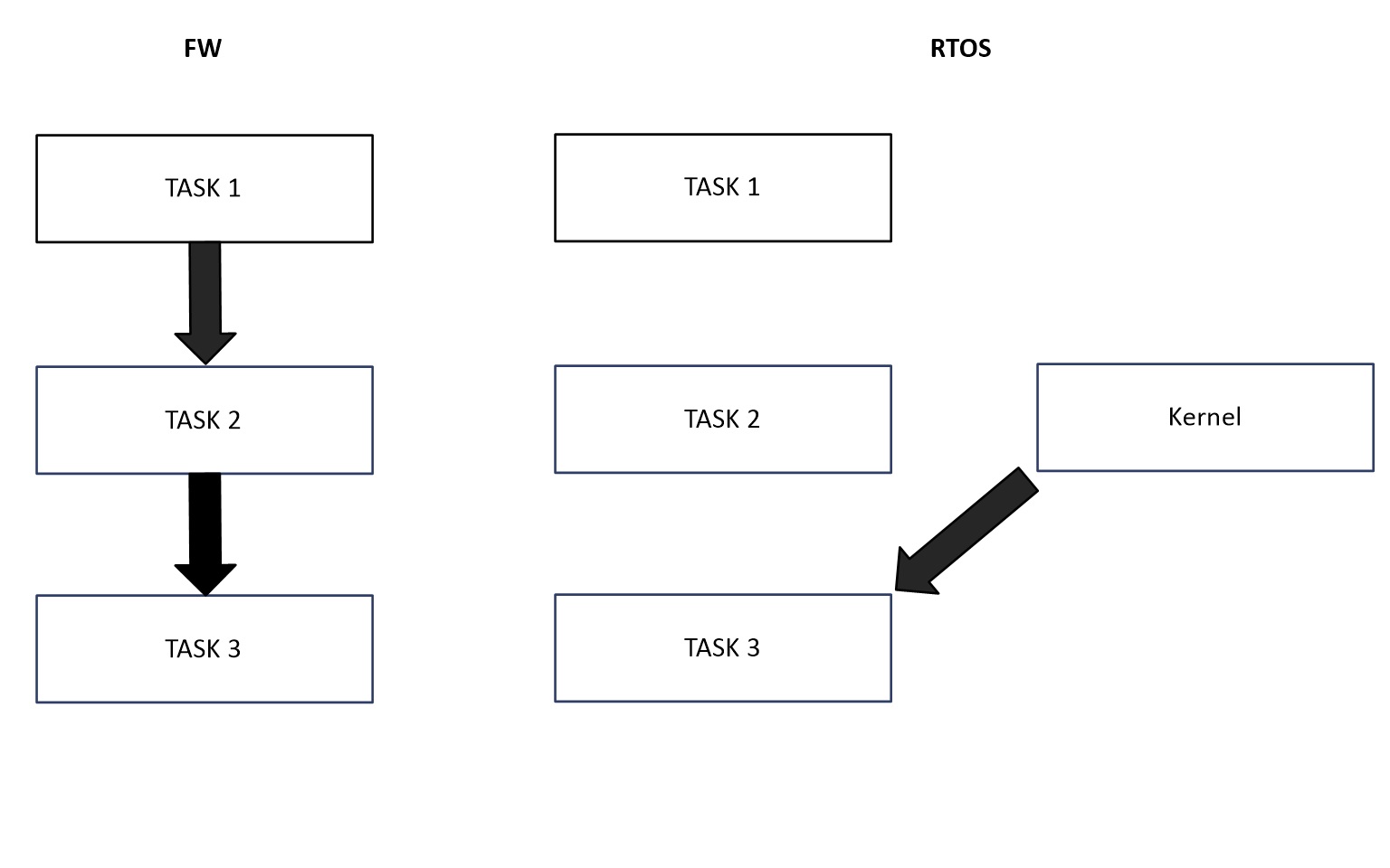 => TASK 3을 실행하기 위해 FW는 TASK1, 2를 거쳐 TASK3이 실행되지만, RTOS는 Kernel에서 TASK3을 바로 실행시킬 수 있다.