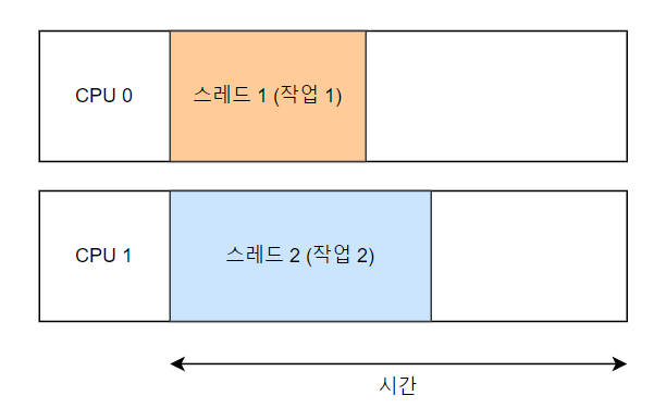 CPU의 개수가 스레드의 개수와 같거나 많으면 동시 작업이 가능해지므로 예시 그림처럼 전체 실행 시간이 줄어들 수 있다. 위 그림처럼 완전히 동시에 실행되는 것이 병렬 처리다. 실제 환경에서는 완벽하게 따로 작동하지는 않을 수 있다.