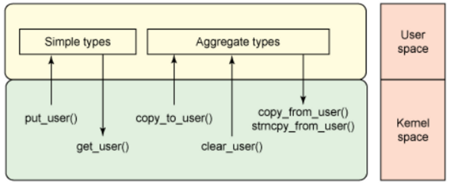 - kernel 영역은 user 영역에서 접근하지 못하는 메모리 영역이기 때문에, pointer를 이용하지 못하고, 데이터를 전달하는 함수를 이용해서 데이터를 서로 건네줘야 한다